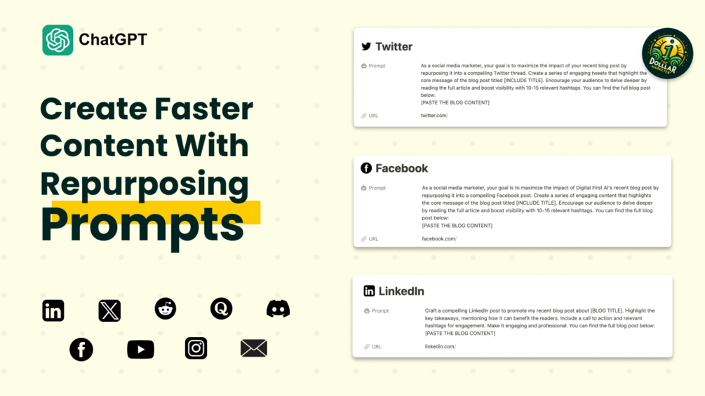 You'll get a content strategy with ChatGPT repurposing prompts, crafted to streamline content creation and management across various social platforms.